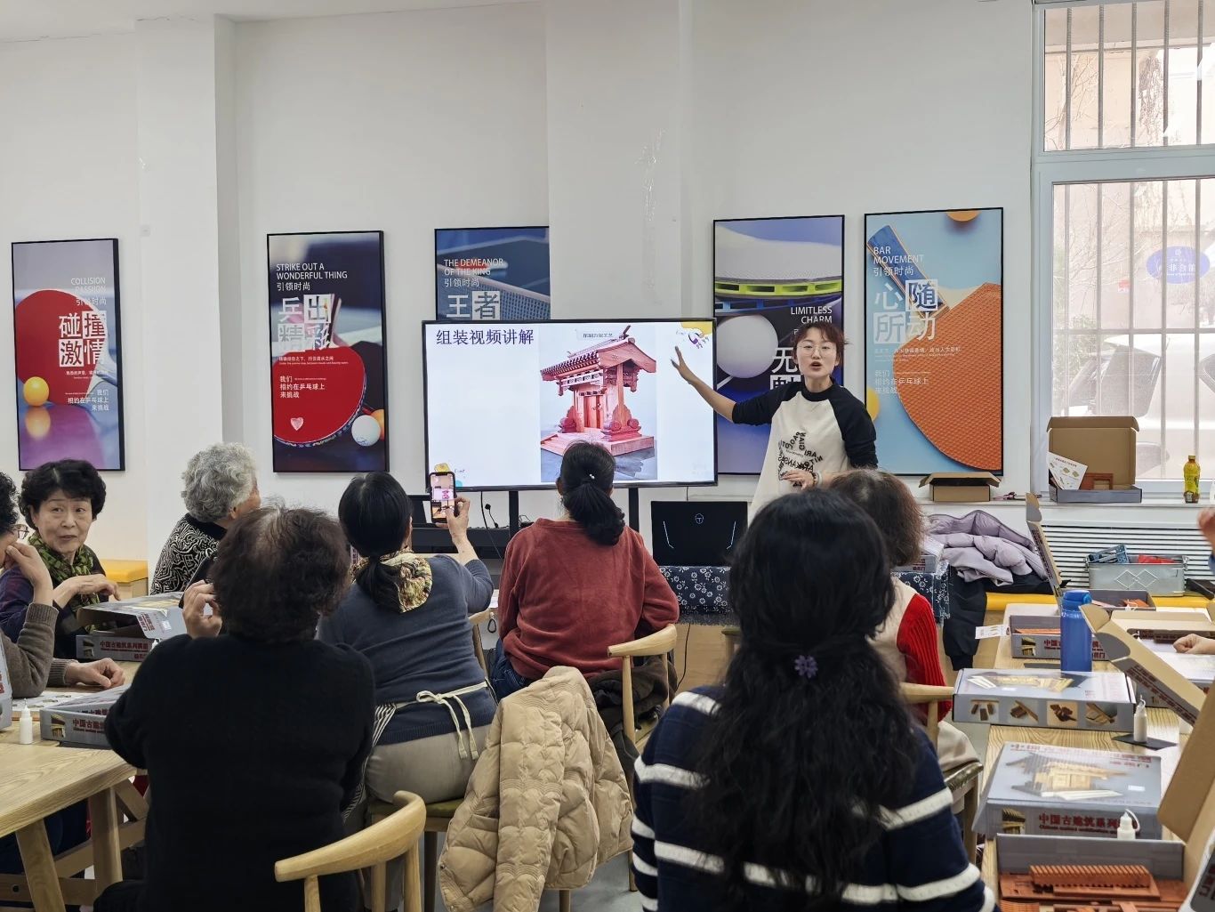 在颐都社区的12节课程中,社区活动室化身为“微缩古建工坊”。从初识垂花门的震撼,到学习复杂构件的困惑,再到最终成品的欣喜,学员们完成了从“木艺小白”到“古建探索者”的蜕变。课程不仅教授传统技艺,更搭建起居民议事平台,社区将非遗课堂作为治理“黏合剂”,以文化认同促进邻里信任。活动间隙,学员们围绕社区改造、志愿服务等话题纷纷献计献策。