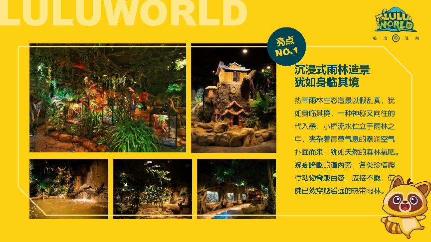 沉浸式雨林造景犹如身临其境热带雨林生态造景以假乱真,犹如身临其境,一种神秘又向往的代入感,小桥流水伫立于雨林之中,夹杂着青草气息的潮润空气扑面而来,犹如天然的森林氧吧。蜿蜒崎岖的道两旁,各类珍惜爬行动物奇趣百态,应接不暇,仿佛已然穿越遥远的热带雨林。千余只海陆空动物安家。