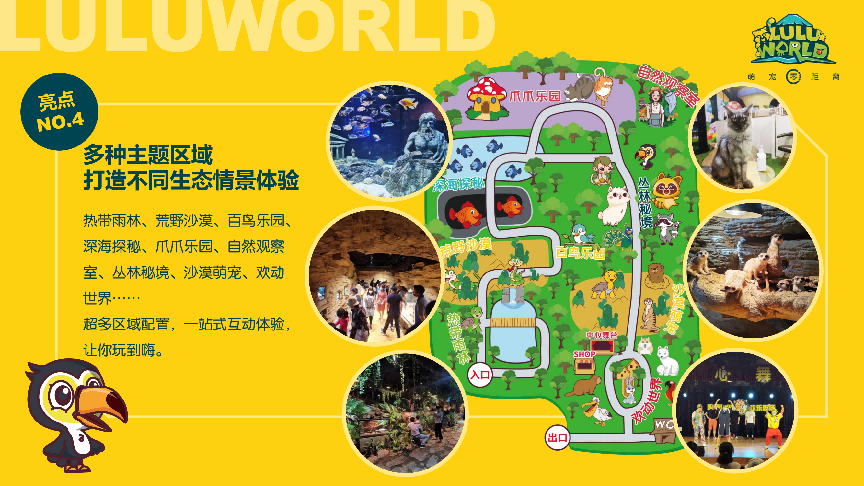 0距离真实动物,面对面互动交流。除了庞大的动物社群外,LuLuWorld还提供您和动物0距离接触的机会!来自全球各地的小动物们会在您的身边。卡皮巴拉、臭鼬、金刚鹦鹉、巨嘴鸟、苏卡达象龟、羊驼、松鼠猴、鹈鹕等都在这里恣意地生活玩耍。走进“动物圈”,和温顺的小动物来场亲密互动,可以亲子拥抱并给他们喂食哦!多种主题区域打造不同生态情景体验热带雨林、荒野沙漠、百鸟乐园、深海探秘、爪爪乐园、自然观察室、丛林秘境、沙漠萌宠、欢动世界……