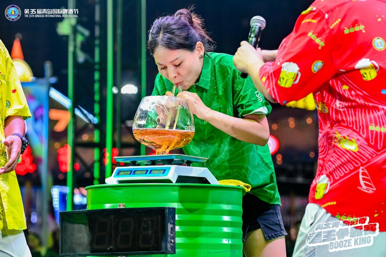 女子组比赛中,来自重庆的90后卫冕女酒王肖肖表现同样抢眼。在“旋一个”(316ml吹瓶速饮)项目中,她以4.97秒的成绩完赛;随后的“哈起来”(1000ml扎啤杯速饮)项目更是一鸣惊人,凭借不输男选手的4.83秒成绩技惊四座。 “白养鱼”(20秒计时速饮)项目,肖肖以1230ml的成绩顺利完成比赛夺魁。