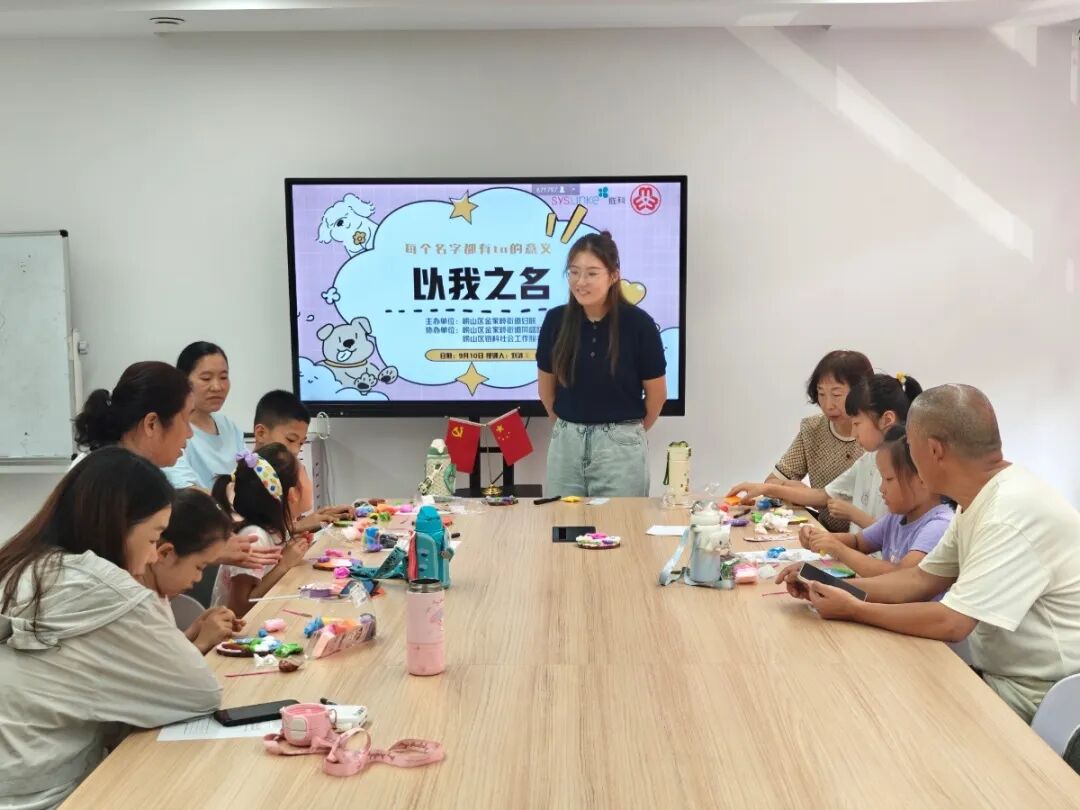 活动最后,居民们共同制作寓意“事事如意”的扭扭棒手工挂饰,在温馨互动中加深彼此理解与信任,将和谐家风融入一针一线的协作中。在同盛路社区开展的“以我之名”儿童青少年家风传承活动同样精彩纷呈。活动以姓名文化为纽带,通过播放短片《以我之名》,带领孩子们探寻名字背后的文化意义与情感寄托。在姓氏起源讲解、名字寓意分享环节,孩子们踊跃发言,讲述名字中饱含的家族爱与期望。在“姓名图腾”手工创作过程中,孩子们以木板和粘土为材,将姓氏篆体与名字意象巧妙融合,创作出独一无二的艺术作品。这些作品不仅是对自我和家庭的认同,更组成了社区“家风树”装置,成为一道亮丽的文化风景线。