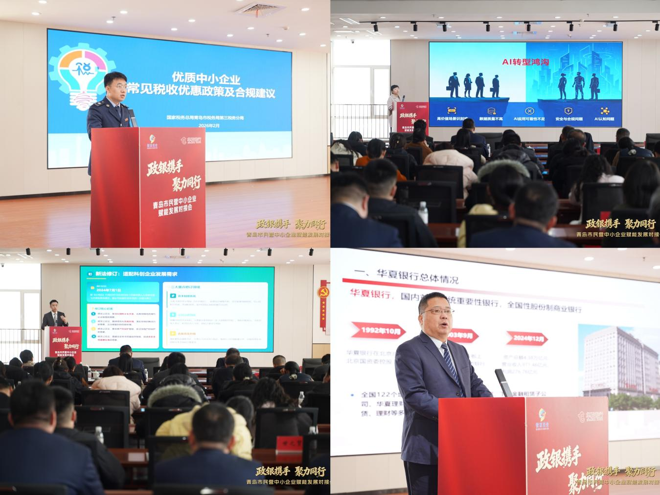 为深入贯彻国家关于支持民营经济高质量发展的战略部署,全面落实山东省民营企业座谈会精神,切实把“坚定信心、铆足干劲,推动民营经济健康发展、高质量发展”的工作部署落到实处,2月11日,由青岛市民营经济发展局、莱西市人民政府、国家税务总局青岛市税务局及华夏银行青岛分行联合主办的“政银携手・聚力同行——青岛市民营中小企业赋能发展对接会”在莱西市成功举办。活动紧扣青岛“10+1”创新型产业体系布局,以“政策赋能、金融‘活水’、全链条服务”为核心,通过政银企深度协同,聚焦中小企业发展瓶颈,为新质生产力培育提供精准支撑,全市部分优质中小企业、金融机构、数字化转型服务商、律师事务所等近百人参会。