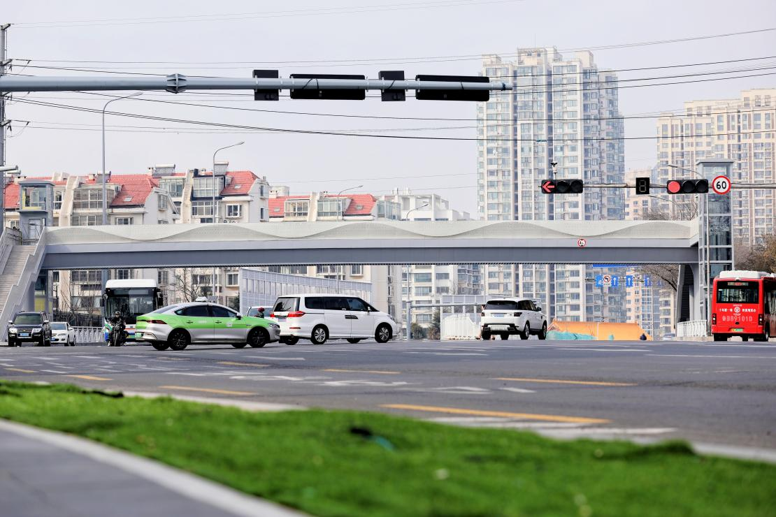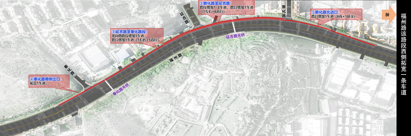 为此,公安交管部门会同住建等部门统筹规划、精准施策,通过道路拓宽改造、增设人行过街设施、打造出市快速通道等举措,扩大入市方向车辆蓄车空间,高效疏导出市方向车流,全力破解路段通行难题。一是拓宽道路空间,提升承载能力。对福州路(奉化路至敦化路段)实施物理拓宽,增设进口车道,优化公交港湾布局,以提升车道通行效率与路段蓄车容量,增强整体通行承载力。二是打造快速通道,疏导出市车流。在该路段南向北方向设置物理隔离设施,保障外侧三条车道连续快速通行,重点强化晚高峰出市车流疏导,减少车流交织,保障主线顺畅。三是建设过街设施,实现人车分离。在福州路奉化路以北、延吉路以北两处节点新建人行过街天桥,并配套无障碍电梯,兼顾周边多个路口行人过街需求,消除人车混行安全隐患,为车辆快速通行创造条件。四是精细路口组织,破解通行瓶颈。对福州路(江西路至敦化路段)沿线各路口进行精细化交通优化,通过绿化带改造、左转车道外置等方式,优化路口车道功能与时空资源,提前化解拥堵节点,整体提升区域路网通行效率。