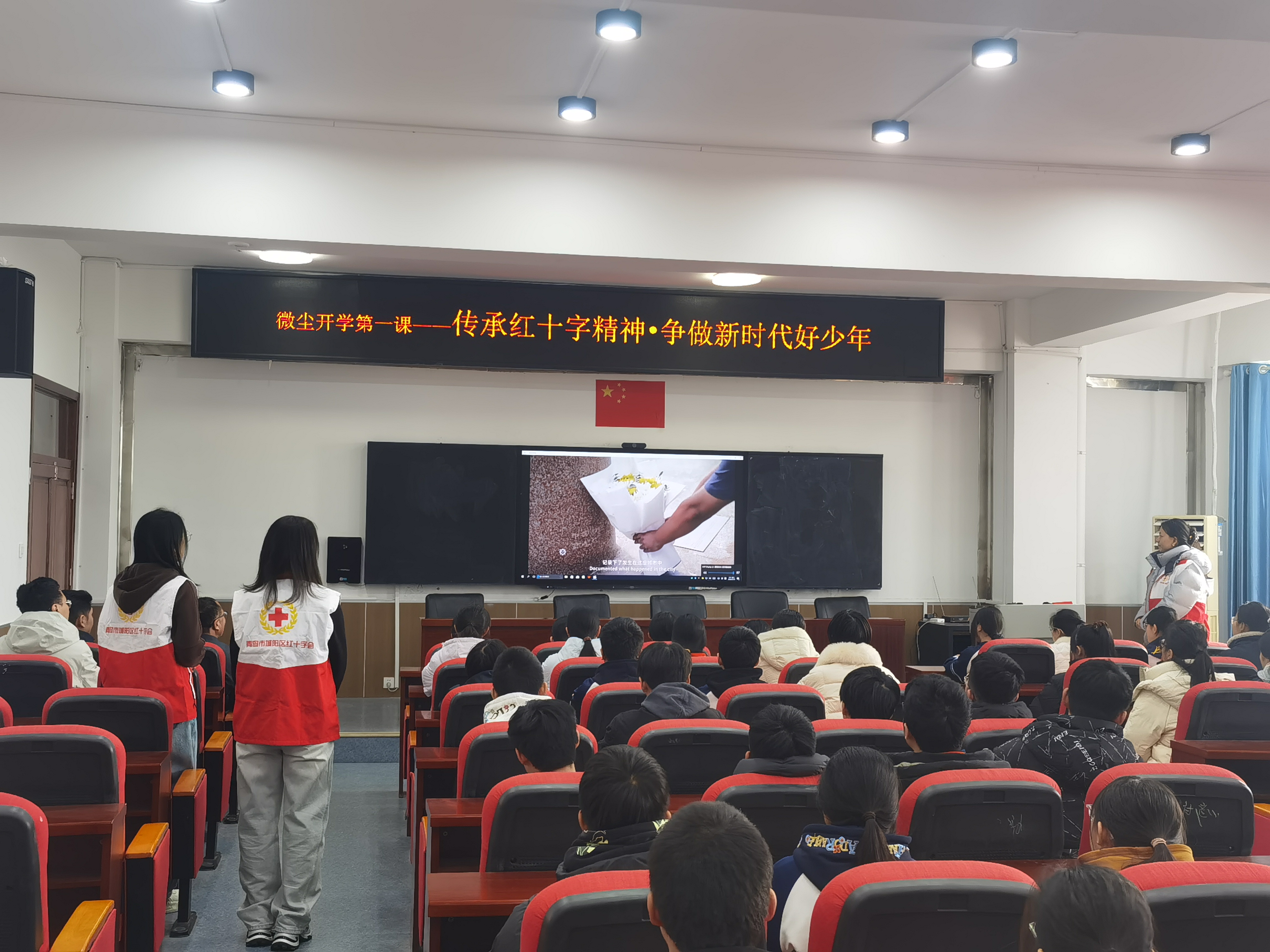 活动现场,统一采用“观看红十字宣传片+红十字志愿者讲师现场讲解”的形式,让抽象的红十字精神变得可感可知、入脑入心。屏幕上,红十字宣传片生动展现了红十字运动跨越160余年的人道传承,一个个温暖的瞬间、一段段感人的故事,带领同学们走进红十字的世界,直观了解红十字的起源与发展历程;现场中,红十字志愿者讲师化身“精神传递者”,结合贴近青少年生活的真实案例,用通俗易懂的语言,细致讲解红十字“人道、博爱、奉献”的核心精神,拆解红十字志愿者的职责使命,分享志愿服务的实践方法,引导同学们明白,奉献从来不是遥不可及的大事,而是藏在身边的点滴善意。