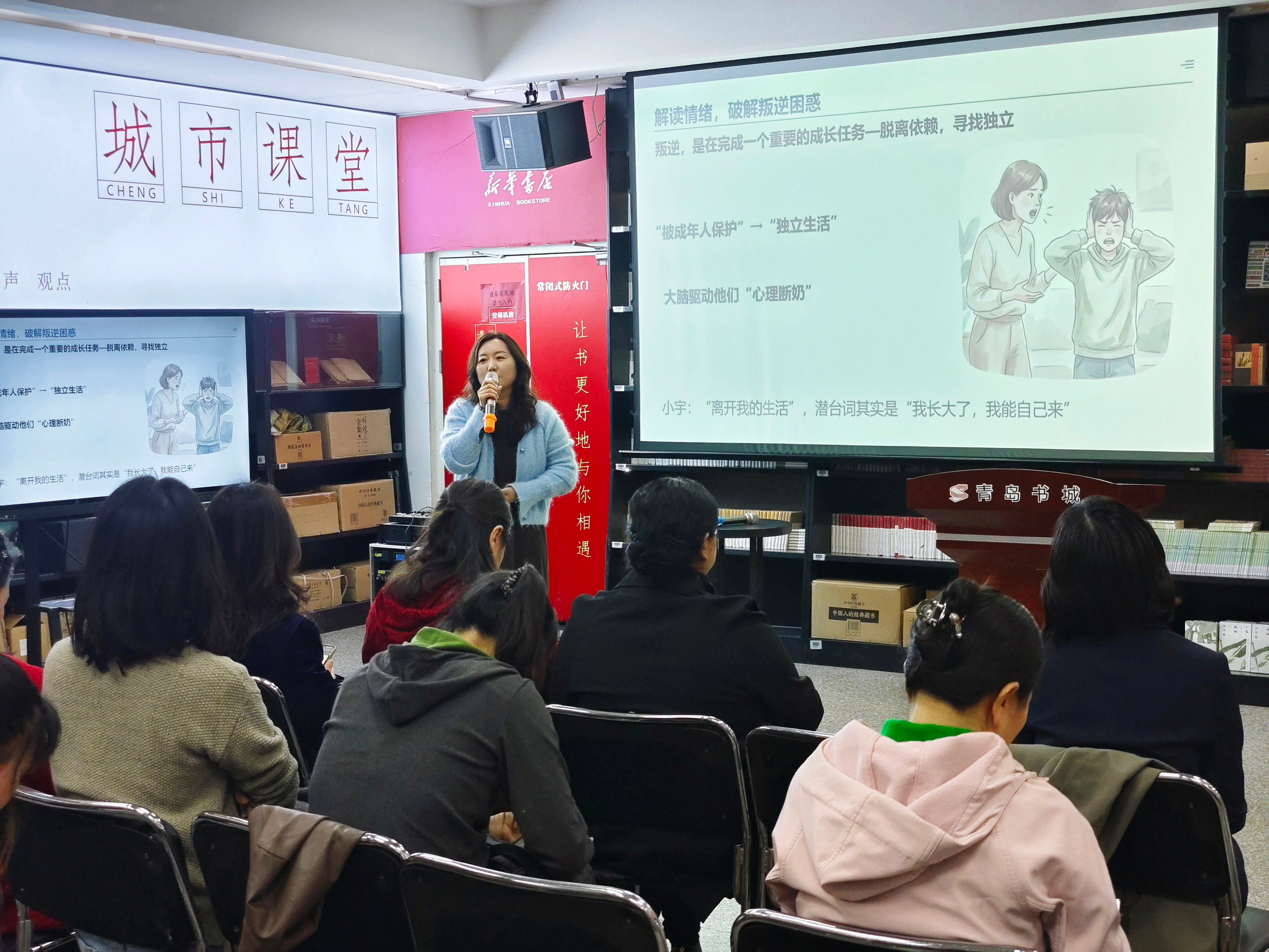春和景明,共育花开。4月18日,青岛市2026年第二期“家教伴成长・同行塑未来”校家社协同育人实践活动在青岛新华书店书城一楼城市课堂如期举行。这场由青岛市教育科学研究院与青岛市新华书店联合打造的公益讲座,全面响应国家校家社协同育人政策要求,初中阶段是孩子人格塑造、学业提升的关键分化期,家庭教育作为育人根基,需要与学校、社会教育同频共振。聚焦初中生青春期成长痛点,为现场及线上家长朋友送上科学育儿“金钥匙”,助力孩子平稳度过初中关键成长阶段,推动青岛家庭教育高质量发展。青岛市教育科学研究院德育与家庭教育研究中心家庭教育教研员王蕾、各区市家庭教育教研员、骨干教师及家长代表现场参会,近千名初中生家长通过线上直播平台同步“取经”,掀起青岛家庭教育学习热潮。