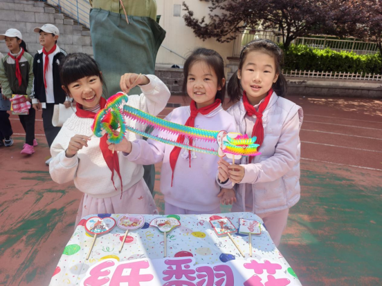 一、二年级专属的传统游戏体验区,是校园里最热闹的角落。学校将经典读物与传统文化深度融合,打造了沉浸式的童趣阅读空间。这里不仅有孩子们亲手制作的童谣儿歌小书整齐陈列,朗朗上口的韵脚在稚嫩的诵读声中婉转流淌;更有《一起长大的玩具》主题布展,陀螺、投壶、纸翻花等老物件一一亮相,带着几代人的童年记忆,唤醒孩子们对传统文化的好奇。踢毽子的轻盈身影、翻花绳的灵巧指尖、丢沙包的欢快追逐……孩子们在传统游戏中尽情撒欢,也在玩乐中读懂了课本里的文字。当书本里的描写变成亲身的体验,静止的文字便有了鲜活的生命力,阅读不再是端坐书桌前的任务,而是奔跑在阳光下、流淌在笑声里的快乐。