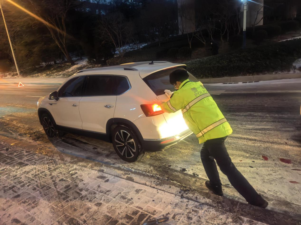 受雨雪天气影响,辖区路面湿滑、能见度降低,出行安全隐患凸显。崂山交警大队坚持“以雪为令、闻警即动”,筑牢道路安全防线。1月19日,松岭新源路路口突发事故,三中队民辅警火速处置,高效化解险情,成功避免二次事故,守护群众出行安全。