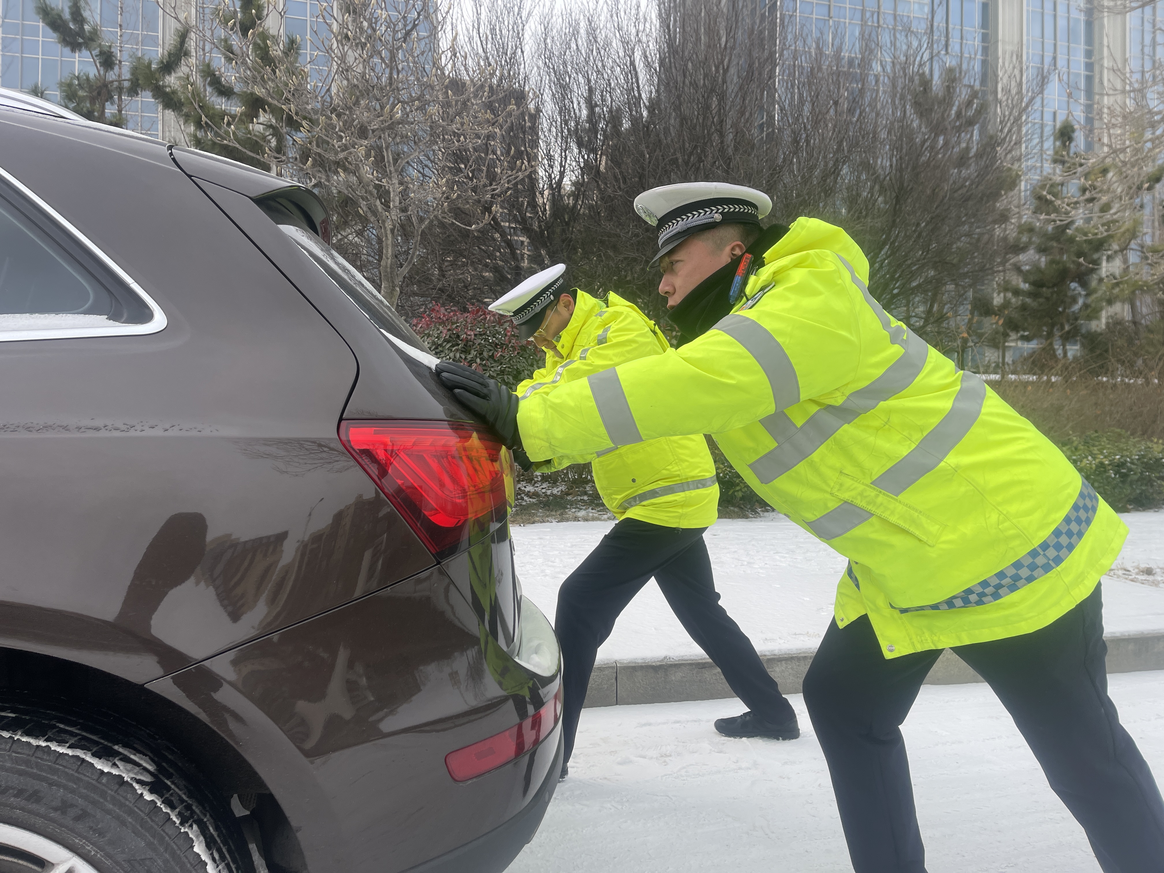 面对恶劣天气,全市各级公安交管部门迅速进入应急状态。全体交通民辅警严格落实24小时值班备勤,强化路面管控、宣传提示与应急保障,聚焦桥梁、坡道、弯道、高架上下桥匝道等易滑易堵重点区域,构建“视频巡检+路面巡逻”立体化管控网络,根据雪情变化动态调整警力部署,在城区主次干道、国省道、高速公路、乡村公路等重点路段加密巡逻频次,通过警车鸣笛警示、喊话提醒等方式,持续警示、引导过往车辆谨慎驾驶、减速慢行、保持安全车距,同时安排警力定点管控,及时处置突发情况。对部分车辆因路面湿滑出现的打滑等情况,执勤民辅警第一时间上前帮扶,徒手推车、清理积雪,用实际行动为群众排忧解难,让寒冬出行充满暖意。