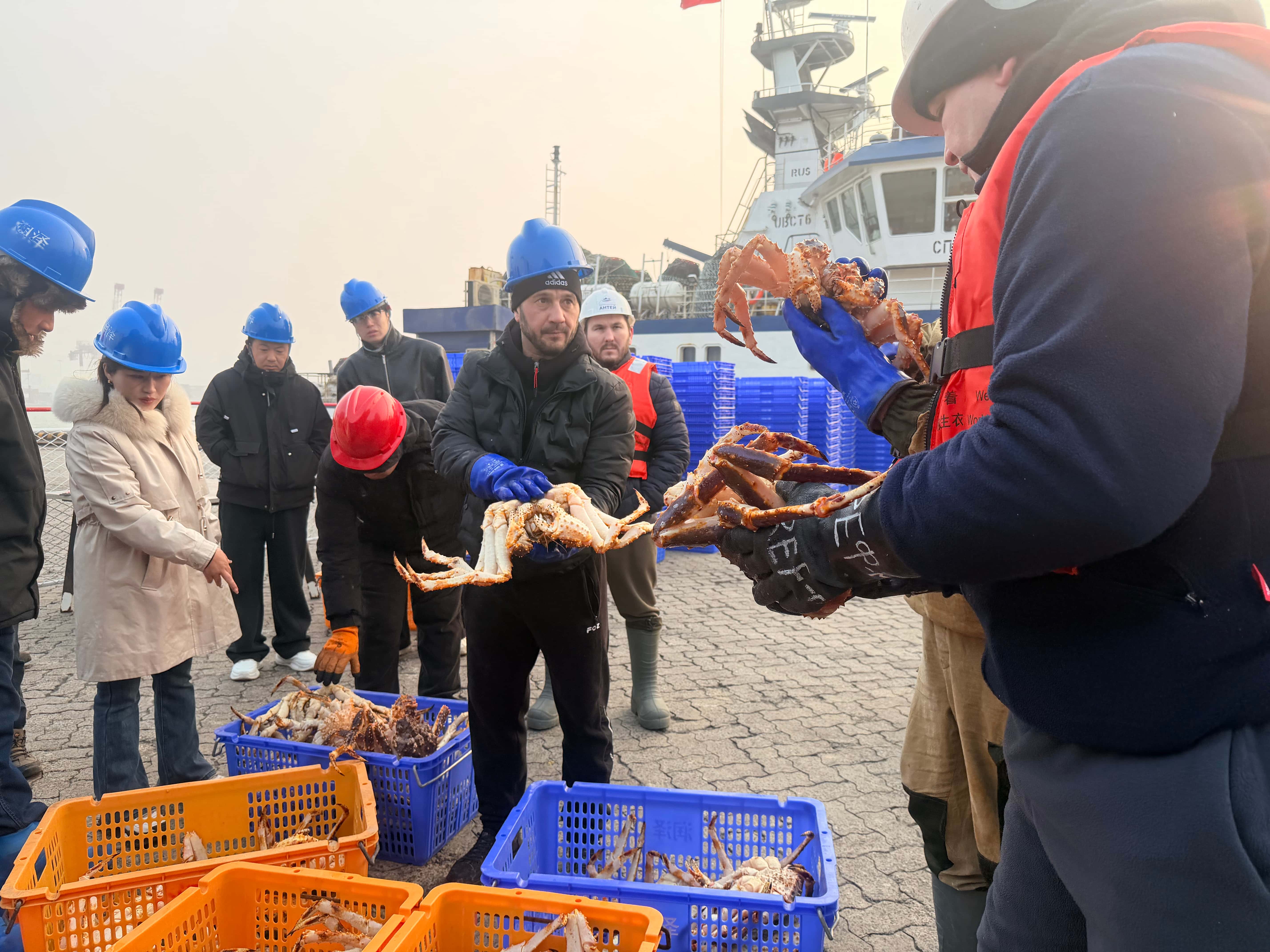 作为拓展高端生鲜物流体系的重要布局,威海港依托毗邻韩国的区位优势,打破以往俄罗斯鲜活水产品经韩国中转的传统模式,在海关、边检等部门支持下,打通直达通道,凭借“暂养池+高效物流+专业冷链”配套能力吸引大宗优质蟹源落地。针对鲜活水产品对时效的极致要求,威海港在威海海关的大力支持下,联动代理单位推出“生鲜专窗+预约查验”服务,实行单证预审、船到即查,开通绿色通道实现查验放行“零延迟”。海关关员提前驻场、卸货查验同步推进,搭配全天候一站式跟踪服务与专人对接,大幅压缩通关周期,全力保障蟹群鲜活度,获得现场采购商高度认可。