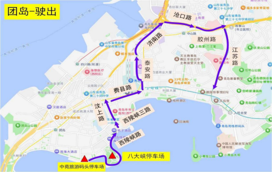 驶出:停车场→西陵峡路→西陵峡三路→汶上路→费县路→泰安路→济南路→沧口路→胶州路→江苏路/热河路