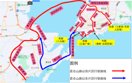 西部(汇泉区域):跨海大桥高架路→重庆高架路→开平路出口→重庆南路→南京路→香港中路→香港西路→文登路→武昌路;