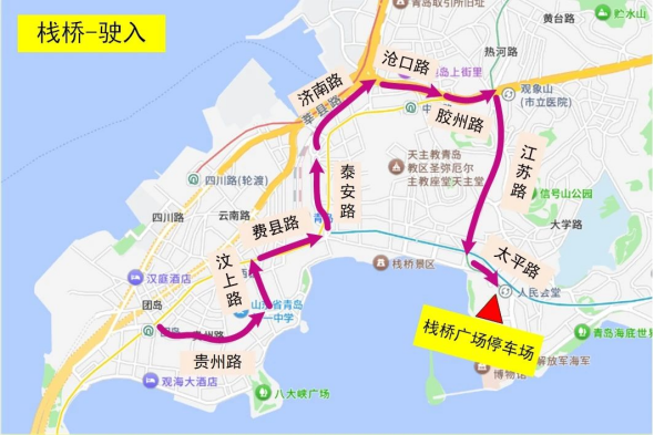 驶入:贵州路→汶上路→费县路→泰安路→济南路→沧口路→胶州路→江苏路→太平路→停车场