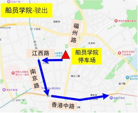 驶出2(备用路线):停车场→武昌路→香港西路(公交车专用道)→香港中路向东行驶