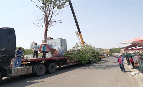 山东商报·速豹新闻网 周辉5月18日上午,青岛栈桥广场地面停车场,几名工人正在顶着烈日从大型运输车上将十几米高的大楸树吊运栽种;而不