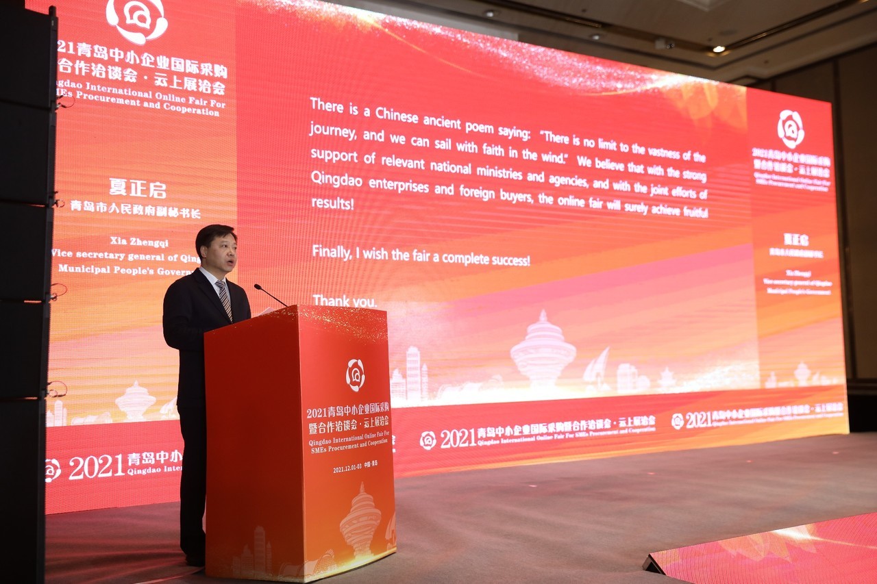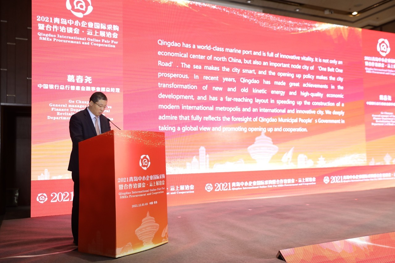 12月1日,“2021青岛中小企业国际采购暨合作洽谈会•云上展洽会”开幕式在青岛香格里拉大酒店正式启动。活动由青岛市人民政府、中国银行主办,青岛市中小企业局、中国银行青岛市分行承办,旨在帮助中小企业更加高效精准的开拓国际市场,打造“一带一路”国际合作新平台。青岛市人民政府副秘书长夏正启、中国银行总行普惠金融事业部总经理葛春尧等领导现场出席开幕式并致辞,来自德国、俄罗斯、日本、荷兰等国际商协会代表和企业代表连线参与开幕式。
