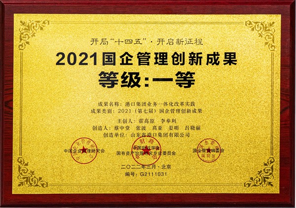 近日,由中国企业管理研究会、中国财政学会国有资产治理研究专业委员会和《国企管理》杂志联合相关部门组织的“2021(第七届)全国国企管理创新成果”等级评选揭晓,由山东省港口集团有限公司主创的实践类管理创新成果“山东省港口集团业务一体化改革实践”获评2021国企管理创新成果第一等级。