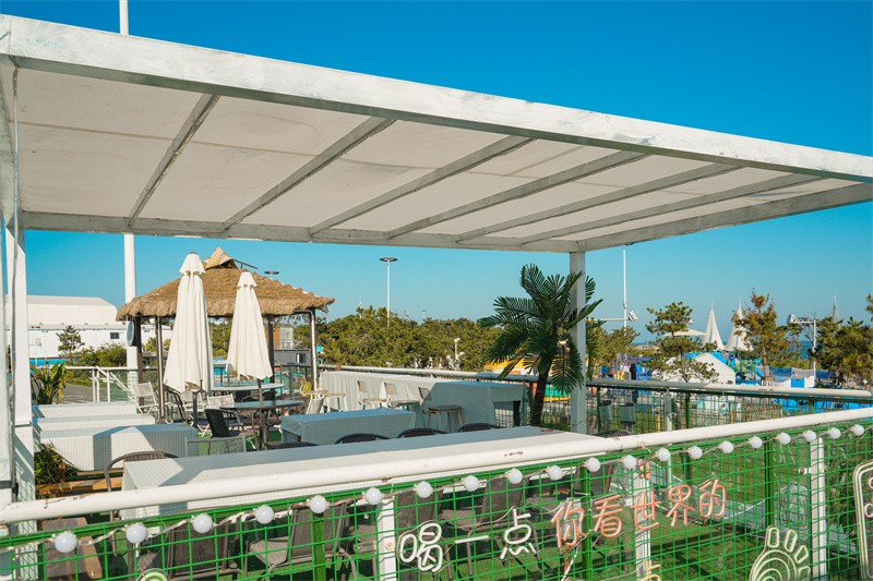 美丽风景之外,爱情海湾还设有6家时尚潮流的特色看海小店,汇聚了美食餐饮、休闲娱乐、体育运动、亲子互动、婚庆旅拍等多元时尚旅游业态。其中,一家名为袛生欢喜的主题音乐咖啡餐吧,以爱情为底色,主打浪漫、舒适、温馨。坐在店内,既可以品尝浓香咖啡,还可以将大海的景色一览无余。店内陈设以工艺风格为主,是情侣约会、姐妹拍照打卡的佳处。