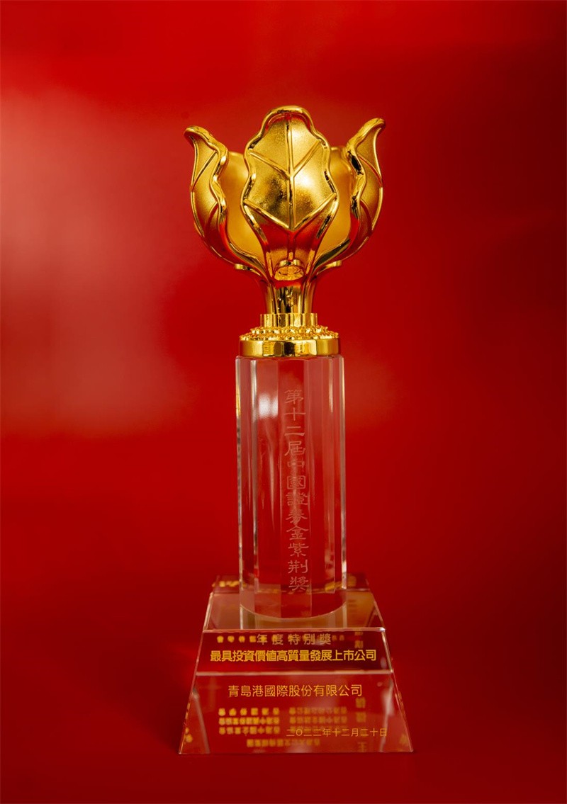 2020年,青岛港荣获中国证券金紫荆奖“最佳上市公司”;2021年,青岛港蝉联中国证券金紫荆奖,荣获“十四五最具投资价值上市公司”和“最佳投资者关系上市公司”两项大奖。