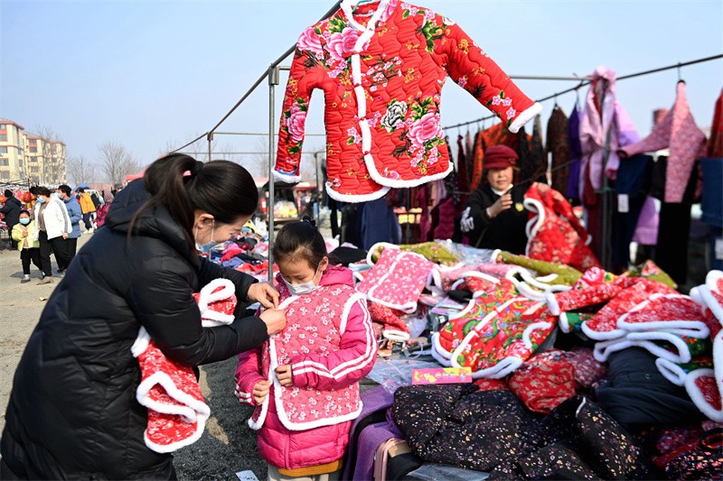山东青岛西海岸西区泊里大集,市民在购买当下流行的花棉袄