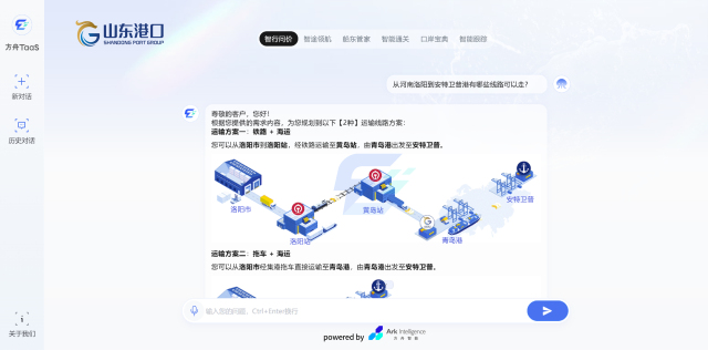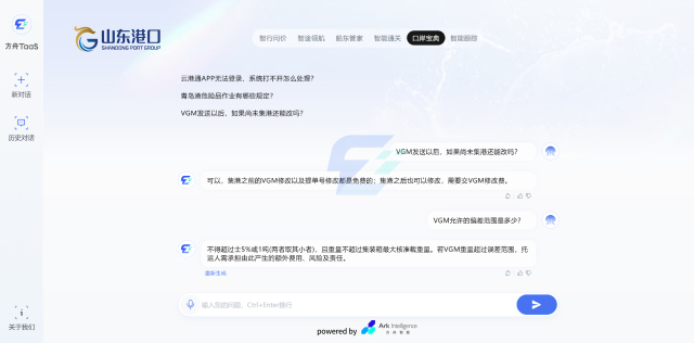 据了解,方舟TaaS大模型依托 “云港通” 平台,基于先进的人工智能技术,充分发挥大模型在自然语言处理、知识推理与决策等方面的强大优势,将智能化服务深入到港口管理的各个环节,覆盖船东、货主、货代等用户群体,以及港口日常管理、经营分析、生产运行、智慧办公、物流服务等多个领域。