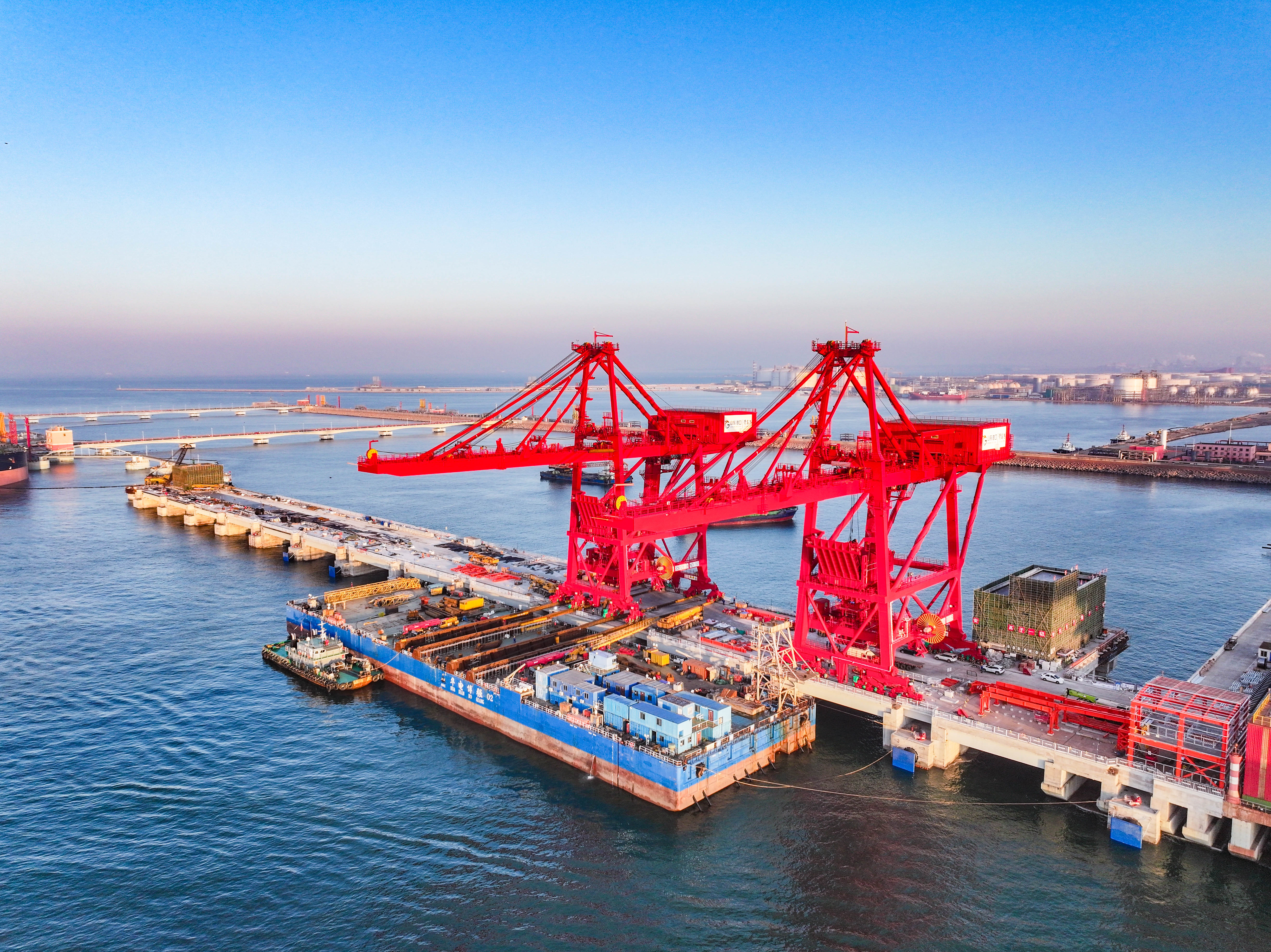 青岛港第二座40万吨级矿石码头2台卸船机上岸 该重点工程预计今年上半年建成、下半年投用