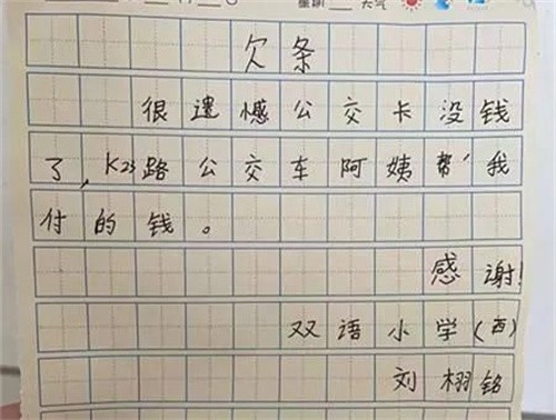 近日,CCTV-13《新闻周刊》报道:在青岛西海岸新区K23路公交车上发生了有爱一幕,驾驶员为一名小学生垫付车费后,小学生写下“欠条”,并用实际行动履行诺言。