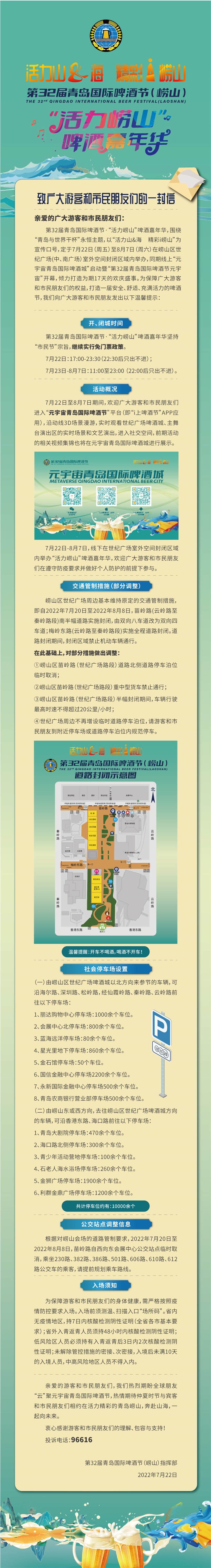 今晚8点,第32届青岛国际啤酒节(崂山)将正式拉开大幕,为了广大游客和市民朋友们能享受到一场安全、舒适、充满活力的啤酒嘉年华,第32届青岛国际啤酒节(崂山)指挥部特别发布《致广大游客和市民朋友们的一封信》。