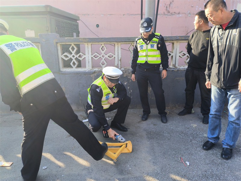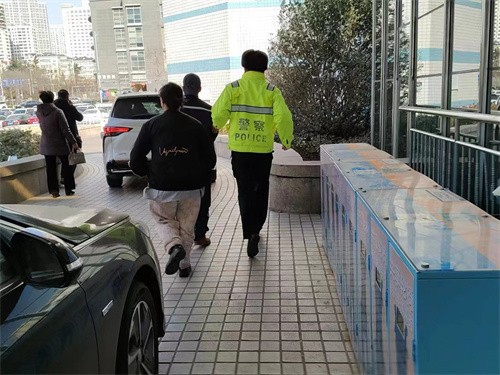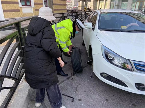 2023年1月31日下午,青岛市南区兰山路与费县路出现了暖心的一幕,一名交警在路边帮助外地游客更换轮胎,让受困车辆转危为安。