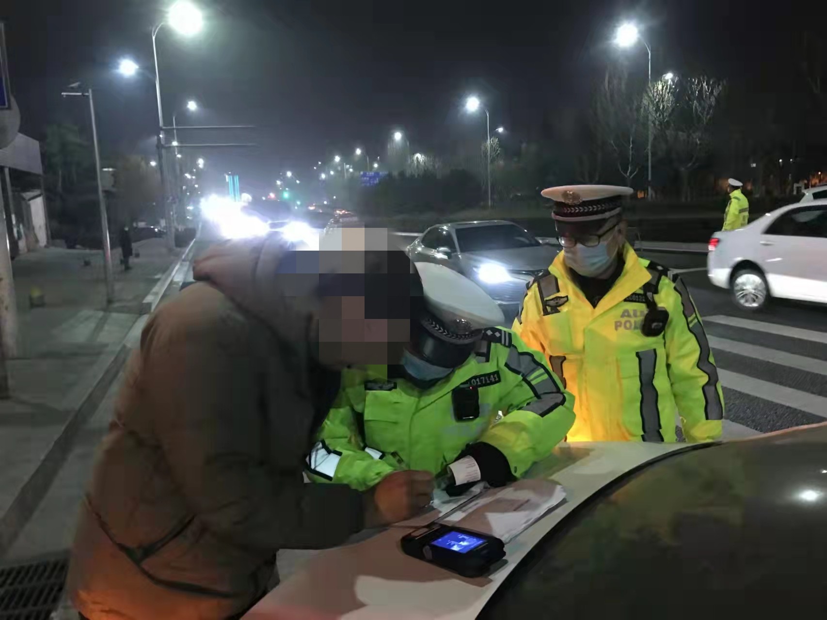 2月20日,青岛交警李沧大队李沙路中队在广水路宜川路路口附近设岗夜查,当晚22时13分许,一辆鲁LQ83**黑色大众牌小型轿车沿宜川路北向南行
