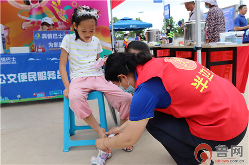 7月16日,一位来自山西的小女孩在啤酒城城内游玩时,不慎将脚踝碰到了岩石上,擦出了血,家长正愁没法消毒处理伤口。“我们有应急药箱,我们来给你处理!”“老兵情”团队的志愿者邢海英连忙扶女孩坐下,拿出服务驿站提前准备好的应急药箱,用碘伏给小女孩的伤口消了毒,并进行简单处置。小女孩家人非常感激,直对师傅们说“青岛风景好,服务超热情,以后孩子放假一定再来!”