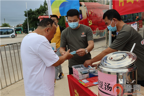 7月17日,“微笑”志愿团队的师傅们凌晨煮好绿豆汤和酸梅汤带到服务驿站,很多游客驻足在志愿服务的凉棚下讨一杯来喝,边喝边夸奖志愿者服务暖心周到。有的游客口罩丢了,志愿者赠送给他们新口罩。有的游客手机没电了,志愿者借给她手机联系家人。还有的游客看到医药箱,难为情地告诉志愿者想拿一个备用,志愿者热情地塞给他好几个,游客竖起大拇指:“青岛的公交服务做的真棒!”