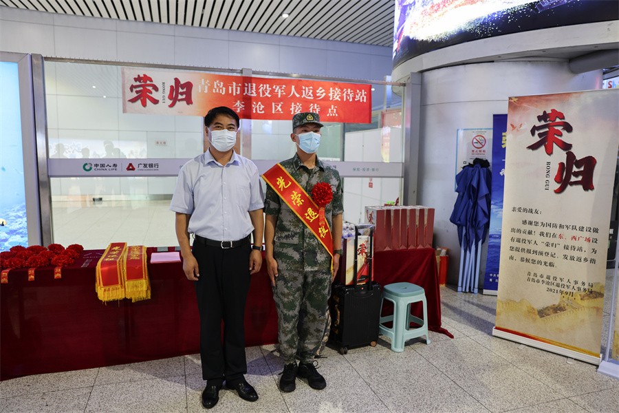 “你们辛苦了!欢迎返乡回家!”9月2日上午,青岛市退役军人事务局局长孙宗子来到青岛火车北站的“返乡接待站”,为光荣返乡、载誉而归的退役士兵戴上“荣归”红花,详细询问了士兵旅途、生活情况,鼓励他们秉承部队优良作风,继续在社会经济发展中贡献力量。