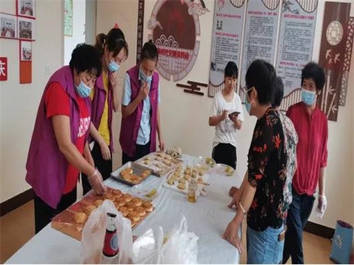 活动中,大家边学边做,压皮、包馅、按压……每个步骤都有条不紊,不一会儿,一个个精美的月饼就成型了。看见自己做成的月饼,大家都很高兴,现场气氛齐乐融融。月饼烤好了,社区妇联主席带领志愿者们将亲手做好的月饼送到行动不便老人和春蕾女童手中,为他们送上中秋节的祝福。