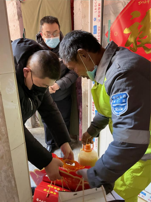 党建广场慰问活动结束后,慰问队伍一行又到交运北洁公司困难职工家里,为他们送去了大米、牛奶、花生油、鸡蛋等生活必需品,温馨的问候给寒冬中的环卫职工平添了浓浓暖意。
