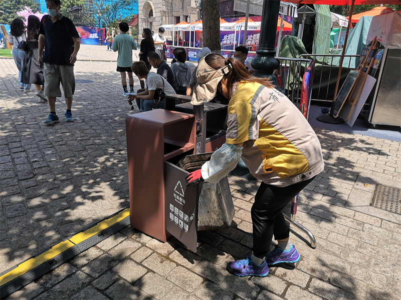 “天主教堂这边是主会场,人流量格外大,产生的垃圾也就格外多,路边的垃圾箱十几分钟就满了,我就得赶紧清理干净。”7月25日上午,市南环卫工人徐秋霞一边清扫地面的落叶和纸屑,一边对记者说。啤酒节开幕期间,他们的工作时间从原本的晚上8点半延时到了10点半,三伏天里,天气炎热,动辄就汗流浃背,保洁工作又脏又累,但是徐秋霞说,作为一名城市美容师,能够让城市变得更加清洁美丽,感觉很自豪。