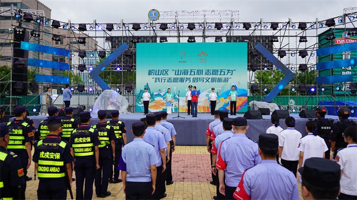 7月31日下午,青岛崂山区“助力百日行动 守护岛城平安”金盾志愿服务活动和“山海五心 志愿五为——践行志愿服务 倡导文明旅游”活动在广场中心舞台正式启动。