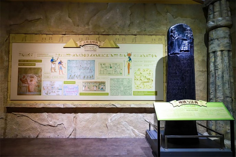 走进啤酒文化博物馆,记者首先看到一面“啤酒简史”墙,一枚枚标志性绿色啤酒瓶盖上,标注了啤酒发展史上的重要年份坐标,并配有简介。再往里走,就步入“文明路标”展厅。一面仿真的泥塑墙一下子将游客拉入历史长河,动静结合呈现出啤酒酿造经历的苏美尔时期、古巴比伦时期和古埃及时期。其中,墙面上的人物因为现代化的投影,被赋予了肢体动作,令整个画面栩栩如生,世界啤酒的发展史以及不同历史时期啤酒酿造工艺发展及产业化进程尽在眼前。