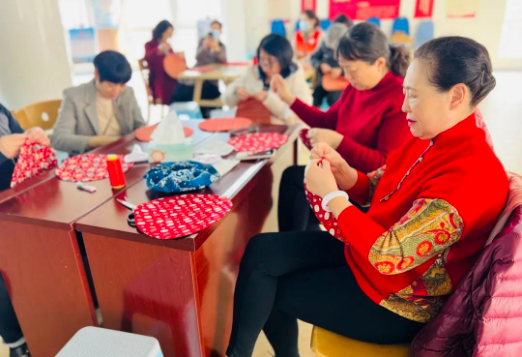 活动伊始,老师详细讲解了此次布艺果盘的制作材料及注意事项,介绍了色彩搭配等基本技巧,并现场展示了制作过程。妇女群众认真聆听、细心琢磨,跟着老师的步骤制作。