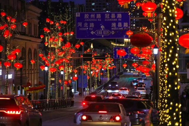 2023年1月27日,青岛中山路、栈桥及老城区张灯结彩,灯火辉煌,人气再次回归。图/视觉中