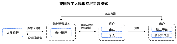 除赋能企业转型外,金融科技的发展还推动着数字人民币加速落地。较其他数字货币,数字人民币拥有绝对安全高效的运行模式,其采用“中央银行-商业机构”的二元体系,即“双层运营体系”。数字人民币由人民银行负责发行、注销、跨机构互联互通和钱包生态管理,再由商业银行作为指定运营机构,牵头提供数字人民币兑换服务。