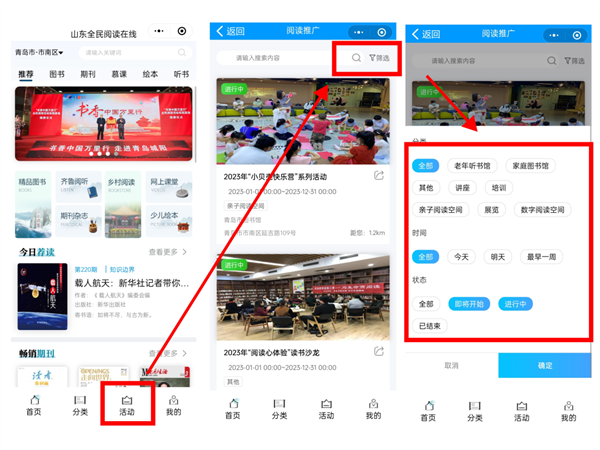 用户可通过【活动】界面查看距离自己最近的阅读活动,并且可以进行筛选,自行选择自己喜爱的阅读活动浏览和收藏。