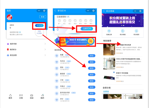 在【我的】界面点击【学习打卡】,可进入每日打卡和阅读任务界面,通过打卡及完成阅读任务可获取阅读积分,该积分可用于在积分商城兑换丰厚奖品。