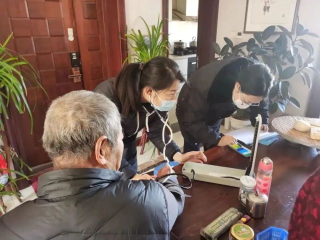 蓝岸馨苑社区联合社区卫生服务中心开展送医上门活动,到银龄党员的家中为他们较为全面地检查了血压、血糖等身体指标,同时询问银龄党员日常的身体状况,针对性地给他们提供了治疗建议。