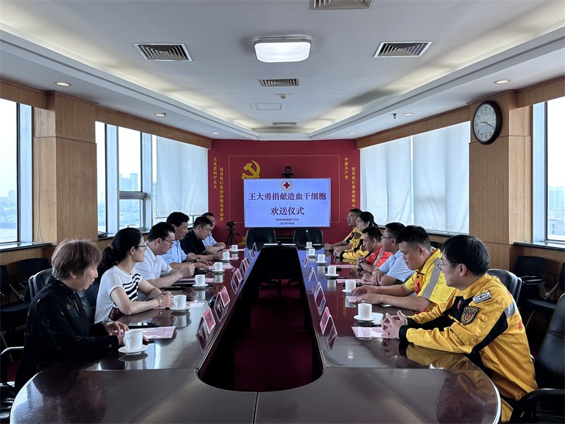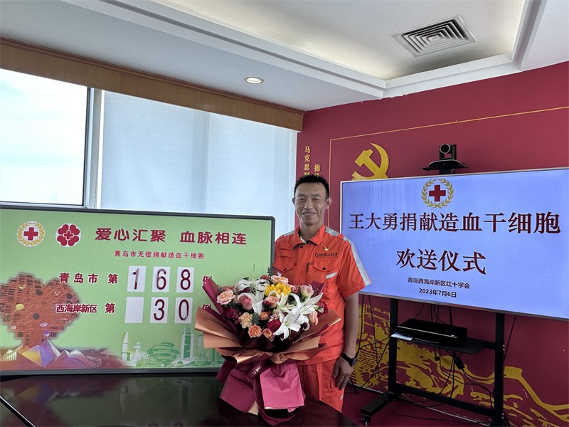 7月6日,青岛市红十字会、西海岸新区红十字会及山东港口青岛港前港公司共同举行仪式,欢送王大勇赴青岛市中心医院捐献造血干细胞。