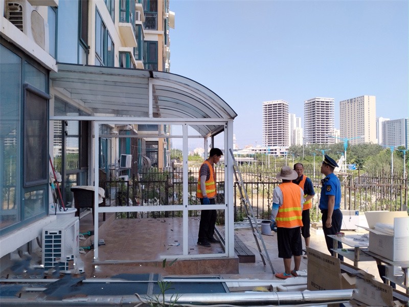 根据前期摸排,该小区部分业主存在违规搭建门厅、水泥台阶等问题,主要用于蔬菜大棚、玻璃花房、衣服晾晒等,这些搭建包占燃气低压架空管,存在极大安全隐患。为加快整治,执法人员在小区内发放、张贴整治通告,并逐一入户、电话走访,会同燃气公司工作人员逐一查看现场,宣传燃气安全及法律法规,动员业主自行拆除清理,经过半个月的动员,集中清理和拆除整治工作正在有序推进中。