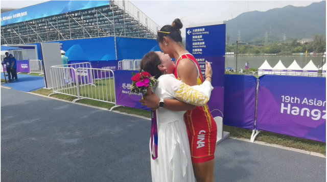 刘晓鑫在获得亚运会冠军后将鲜花献给母亲