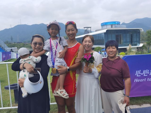 刘晓鑫在摘得亚运会金牌后与家人合影留念