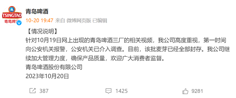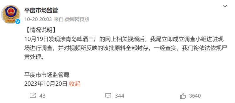 当晚,山东省平度市市场监督管理局也回应称,10月19日发现涉青岛啤酒三厂的网上相关视频后,该局立即成立调查小组进驻现场进行调查,并对视频所反映的该批原料全部封存。