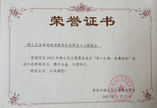 鉴于金家岭街道新联会积极参与“爱心认领 消费助农”活动,崂山区志愿服务协会对其爱心义举特发感谢信表示感谢。