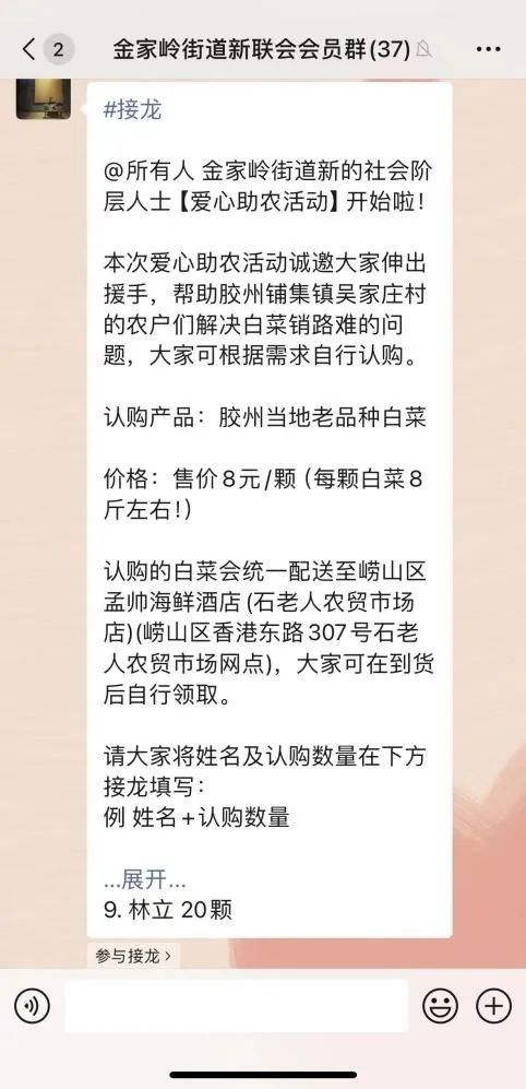 在对吴家庄村农户们的救助信息进行详细了解后,金家岭街道新联会在微信群内开展了一场“爱心接力”。会员们积极响应,纷纷接龙,进行爱心认购。短短20分钟便认购了1600斤大白菜,为农户们送去了关怀和温暖。看着新鲜白菜装满车厢,菜农们的脸上露出了笑容。